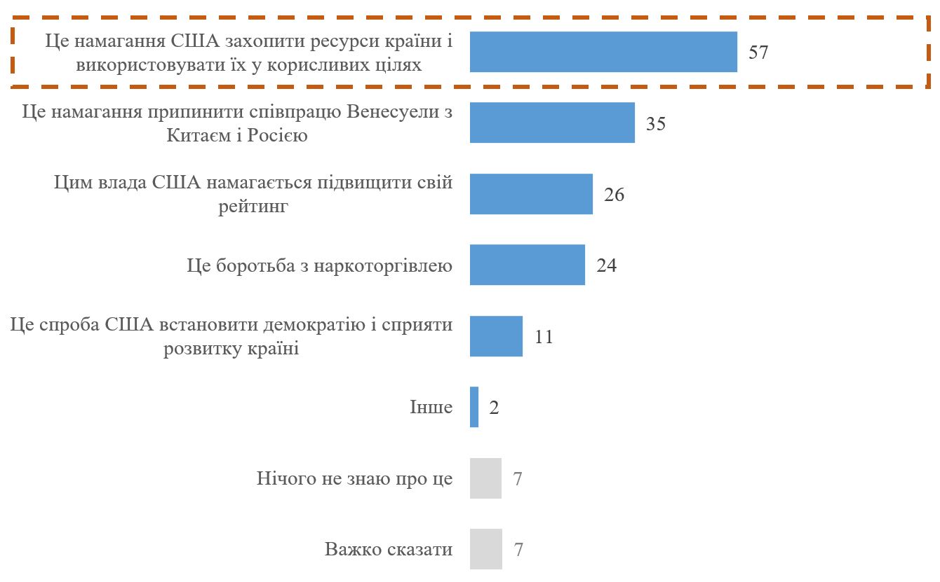 Під час опитування респондентам зачитувалися 5 можливих трактувань дій США у Венесуелі, а респонденти мали відповісти, з якими вони згодні (респондент міг обрати будь-яку кількість відповідей, а також назвати свій варіант). Отже, більшість респондентів вважають, що у Венесуелі США намагаються захопити ресурси країни і використовувати у корисливих цілях (57%). Також багато респондентів говорили про намагання припинити співпрацю Венесуели з Китаєм і Росією (35%), намагання влади США підвищити свій рейтинг (26%) і про боротьбу з наркоторгівлею (24%). Найменше респондентів обрали варіант про спробу встановити демократію в країні (11%).