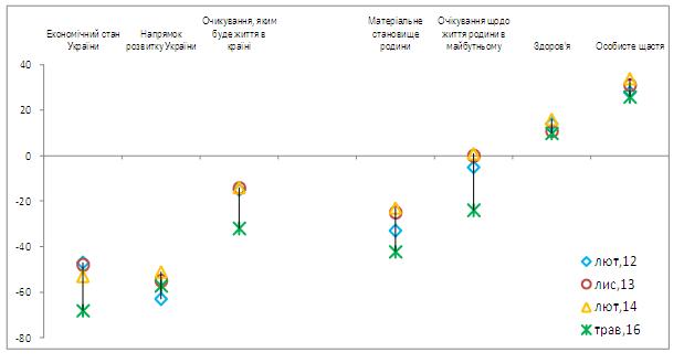 Для оцінювання й моніторингу суспільного та індивідуального самопочуття КМІС вже п'ять років поспіль використовує систематичне вимірювання двох індексів: Індексу суспільного благополуччя (ІСБ) та індексу індивідуального благополуччя (ІІБ). Значення індексів можуть коливатися від -100 до 100 балів, де -100 вказує на найнижчі оцінки ситуації і незадоволеність, а 100 – на найвищі оцінки й загальну задоволеність ситуацією в країні чи власному житті. Детальний опис методології розрахунку індексів можна знайти у Додатку. У травні 2016 року середнє значення ІСБ становило -59, тоді як індивідуальне благополуччя було оцінено значно вище – на рівні -8 балів. Така велика різниця у показниках показує, що, попри усі негаразди, українці в середньому набагато більше задоволені власним життям, ніж життям країни. Ти не менш не можна казати, що це два паралельні світи, оскільки між ними є прямій кореляційний зв’язок, який дедалі стає більш тісним (у 2014 році коефіцієнт, що описує тісноту зв»язку r дорівнюює r=0.28, а у 2016 році r=0.48; максимально можливе значення цього коефіцієнту дорівнює 1).