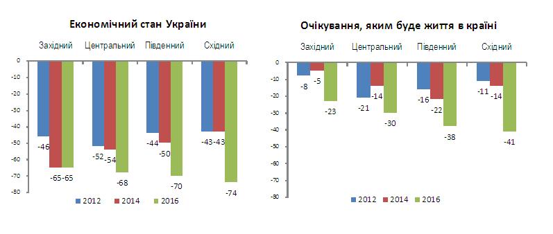 Графік 2. Зміни складових індексів ІСБ та ІІБ в Україні протягом 2012-2016 років. В цілому для країни середнє значення Індексу суспільного благополуччя знизилося на 13 пунктів порівняно з оцінками 2014, а Індекс індивідуального благополуччя знизився на 16 пунктів. Ці зміни відбулися переважно за рахунок низьких оцінок поточного і майбутнього економічного стану родини і країни Так, оцінка економічного стану країни впала на 15 пунктів, матеріального становища родини на 19 пунктів. Звертає увагу також негативні очікування щодо майбутнього життя країни (відбулося падіння на 18 пунктів) і власної родини (падіння на 25 пунктів). Як бачимо, власні матеріальні труднощі люди оцінюють суттєво гірше, ніж ситуацію в країні. На значення ІСП та його складових суттєво впливає регіон проживання (більше інформації у табл. Д1 у додатку). Зазначимо, що оцінки матеріального стану України дуже подібні за регіонами із незначним зростанням негативних показників під час просування від заходу та центру на південь і схід. А очікування від майбутнього життя країни демонструють такий самий тренд, тільки дещо більш помітно виражений (графік 3). Графік 3. Регіональні відмінності у динаміці оцінок економічного стану та очікувань, яким буде життя в країні. Значення ІІС найбільше залежить від статі та віку респондентів. Жінки до 50 років почувають себе набагато щасливішими, ніж чоловіки, а потім ситуація змінюється на протилежну. Натомість, чоловіки усіх вікових груп почувають себе набагато здоровішими за жінок. Найбільше різницю в загальному індексі ІІБ спричинює те, що жінки зазвичай вважають свою родину менш забезпеченою і більш пессимістично зараз оцінюють перспективи життя родини через рік. Варто відзначити, що з віком у респондентів знижується кількість позитивних оцінок щодо всіх складових індексу, при цьому найбільшу різницю між наймолодшою та найстаршою віковими групами можемо спостерігати щодо питань самооцінки здоров’я та щастя.
